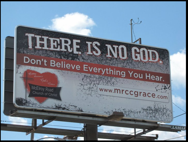 Not only are they telling us that god doesn’t exist (in a large font, no less), they’re also telling us to be skeptical of what we hear!