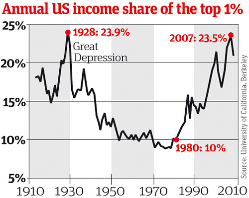 If you want to get some idea of why the 99 per cent movement has attracted so much support in the US, just take a look at this graph. Over the last thirty years, the share of income taken by the top 1 per cent of Americans has risen from 10 per cent to 23.5 per cent . . . As you’ll notice, from the 1950s onwards, income distribution in the US remained broadly stable until the Thatcher-Reagan revolution. The neoliberal policies pursued by the Reagan administration – tax cuts for the wealthy (the top rate of tax was reduced from 50 per cent to 28 per cent), deregulation and privatisation, led to a dramatic rise in inequality.