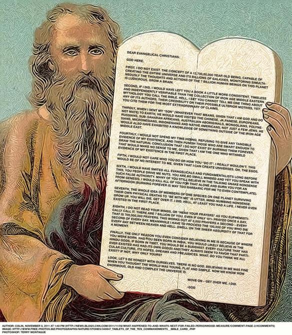 Sixth, I would have smited all evangelicals and fundamentalists long before this. You people drive me nuts. You are so small minded and yet you speak with such false authority. Many of you still believe in the talking snake nonsense from Genesis. I would kill all of you for that alone and burn you for an afternoon (burning forever is way too barbaric for me to even contemplate).