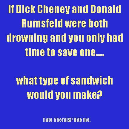 JUSTICE: “If Dick Cheney and Donald Rumsfeld were both drowning . . . “ Posted on 06.16.2013 by AlwaysQuestionAuthority Reply h/t: Hate Liberals? Bite Me.