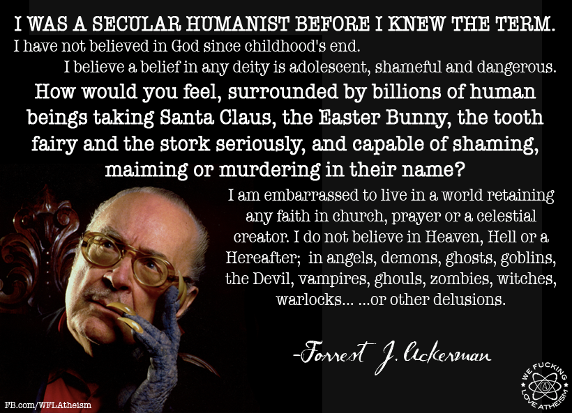 This entry was posted in Antitheism, Atheism, Bigotry, Christian Privilege, Christian Proselytization, Christianity, Empathy, Enlightenment, Humanities, Intellectual Curiosity, Intellectualism, Metaphysics, Moral Philosophy, Morality, Philosophy, Quotation, Reason, Religion, Religiosity, Religious Indoctrination, Religious Malevolence, Secularism, Writing and tagged Forrest J. Ackerman, SECULAR HUMANISM by AlwaysQuestionAuthority. Bookmark the permalink.