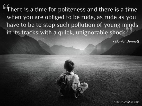 RELIGIOUS CHILDHOOD PSYCHOLOGICAL ABUSE AND INDOCTRINATION: “You are Obliged to be Rude!” / Daniel Dennett Posted on 12.28.2013 by AlwaysQuestionAuthority 1 h/t: Atheist Republic