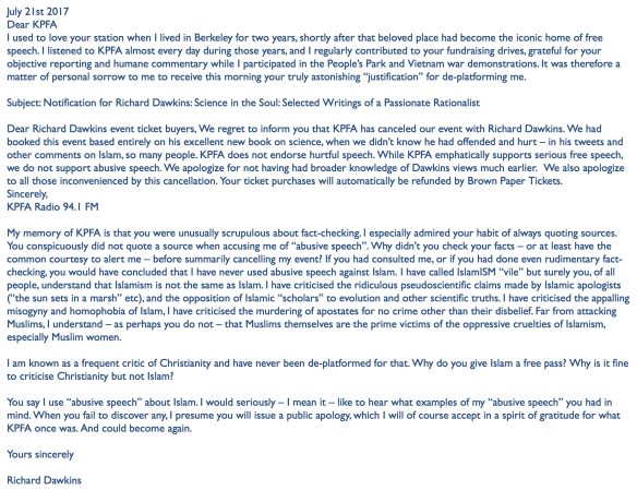 CENSORSHIP: “Brilliant Response from @RichardDawkins to KPFA’s Ridiculous Cancellation of His Lecture Aug 9” ☮